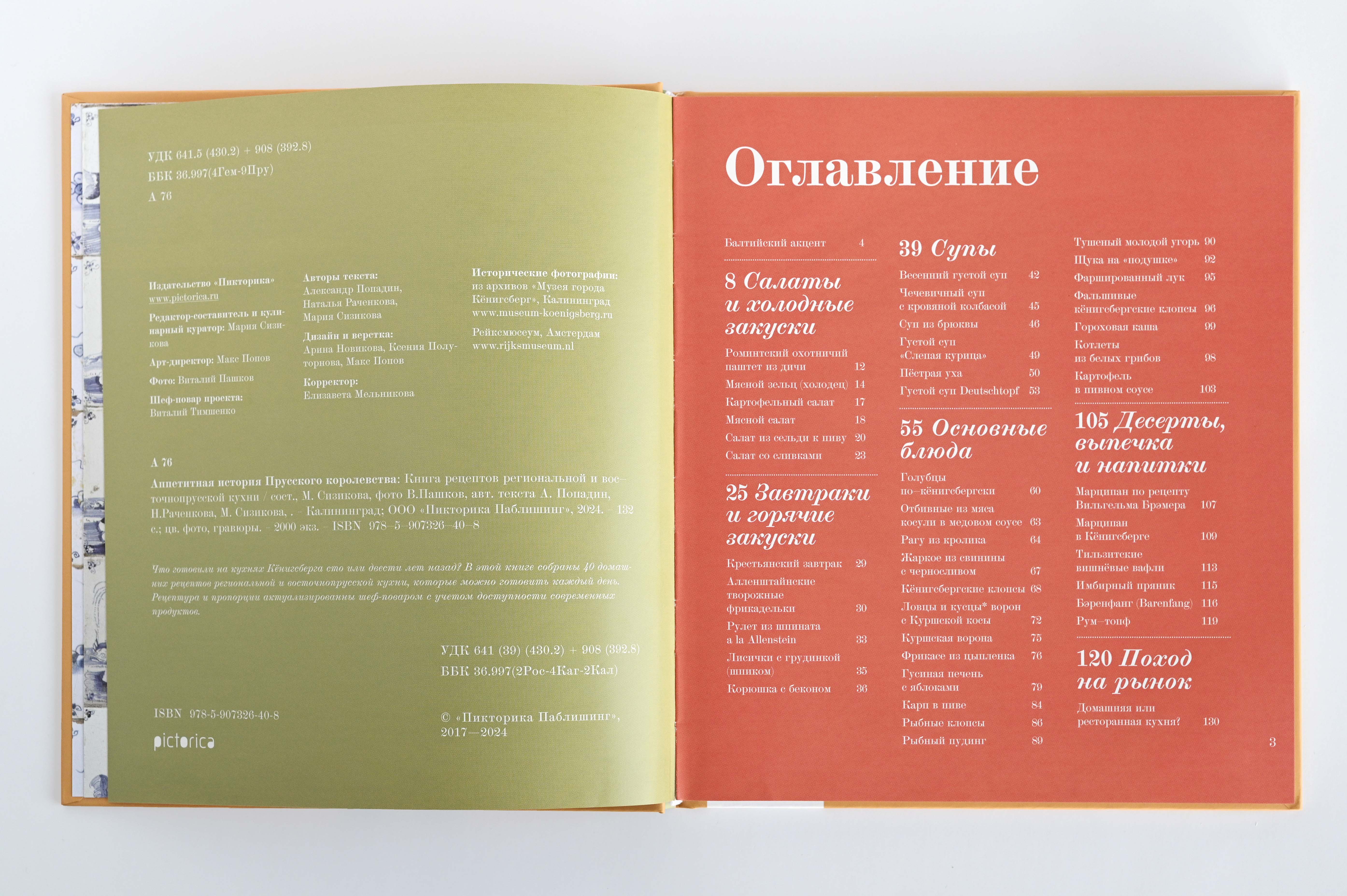 В книге "Аппетитная история Прусского королевства" собраны 40 рецептов региональной и восточнопрусской кухни, которые можно готовить каждый день. Рецептура и пропорции актуализированы шеф-поваром с учетом доступности современных продуктов, а красочные иллюстрации превращают издание из книги рецептов в фотоальбом, объединяющий воедино поварское искусство и историю Восточной Пруссии. Иллюстрированная книга рецептов расскажет что готовили в старину домохозяйки Кнайпхофа и рестораторы Шпандинена, чем потчевали жителей Альтштадта 100 лет назад и туристов в Раушене, как утоляли голод лёбенихтцы, что едали от души в Кранце, чем лакомились в Пальмникене и как создать эти блюда с использованием современных продуктов из шпандиненского гастронома.