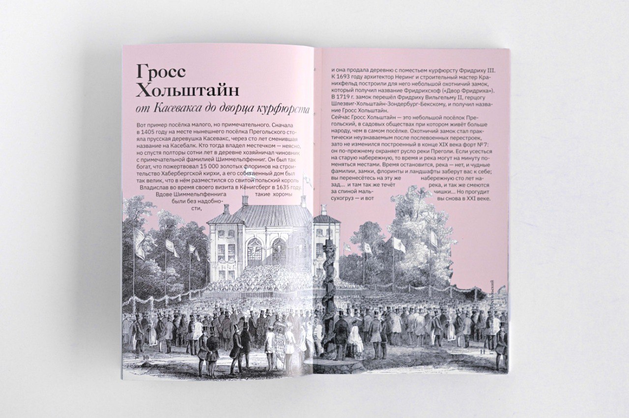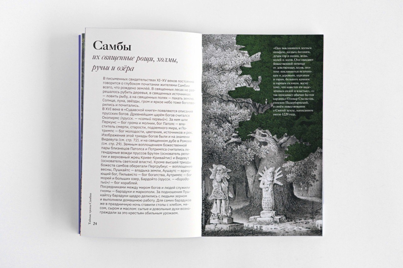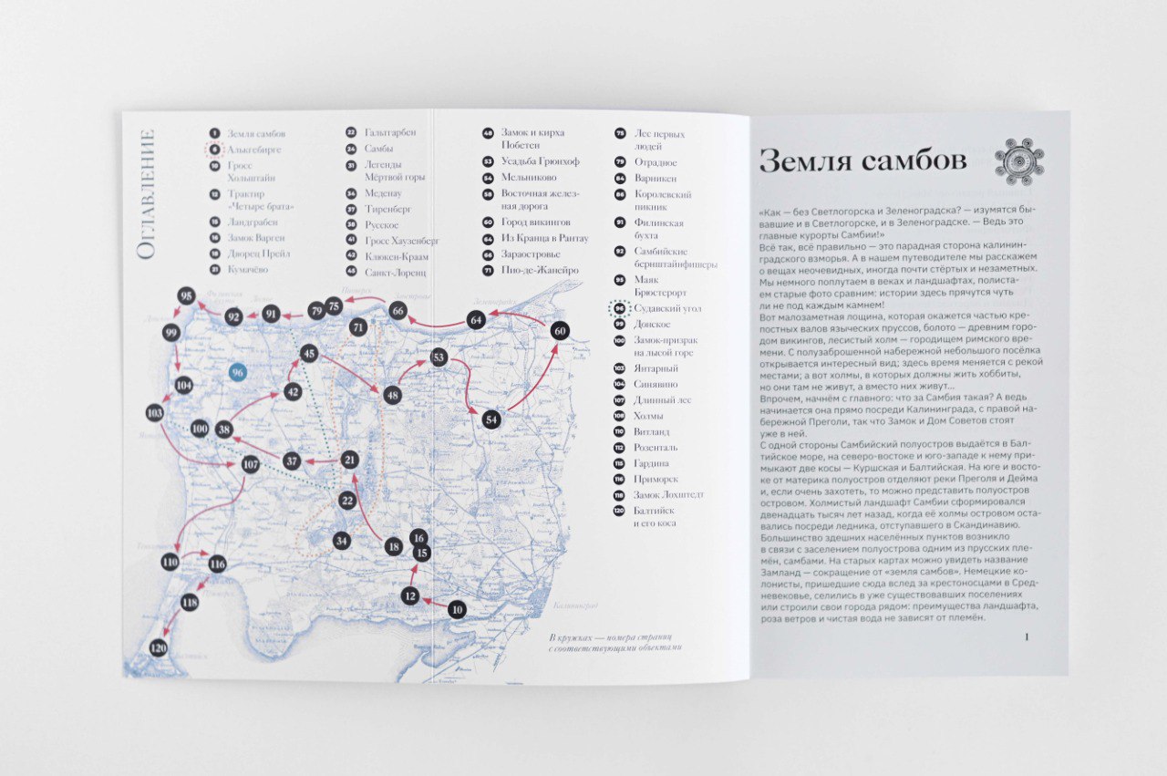 Путеводитель рассказывает истории мест, холмов и руин Самбийского полуострова. Маршрут обходит полуостров два раза: один круг внутренний, по дворцам прусской аристократии и священным холмам древних самбов. Второй, вдоль побережья от Зеленоградска до Балтийска, по небольшим городкам, забытым легендам тёмных лесов и оврагов (и отдельно даже по геологии обрывистых берегов и истории добычи янтаря), замкам и городам исчезнувшим во времени, по огням маяков — вплоть до ангаров Балтийской косы.