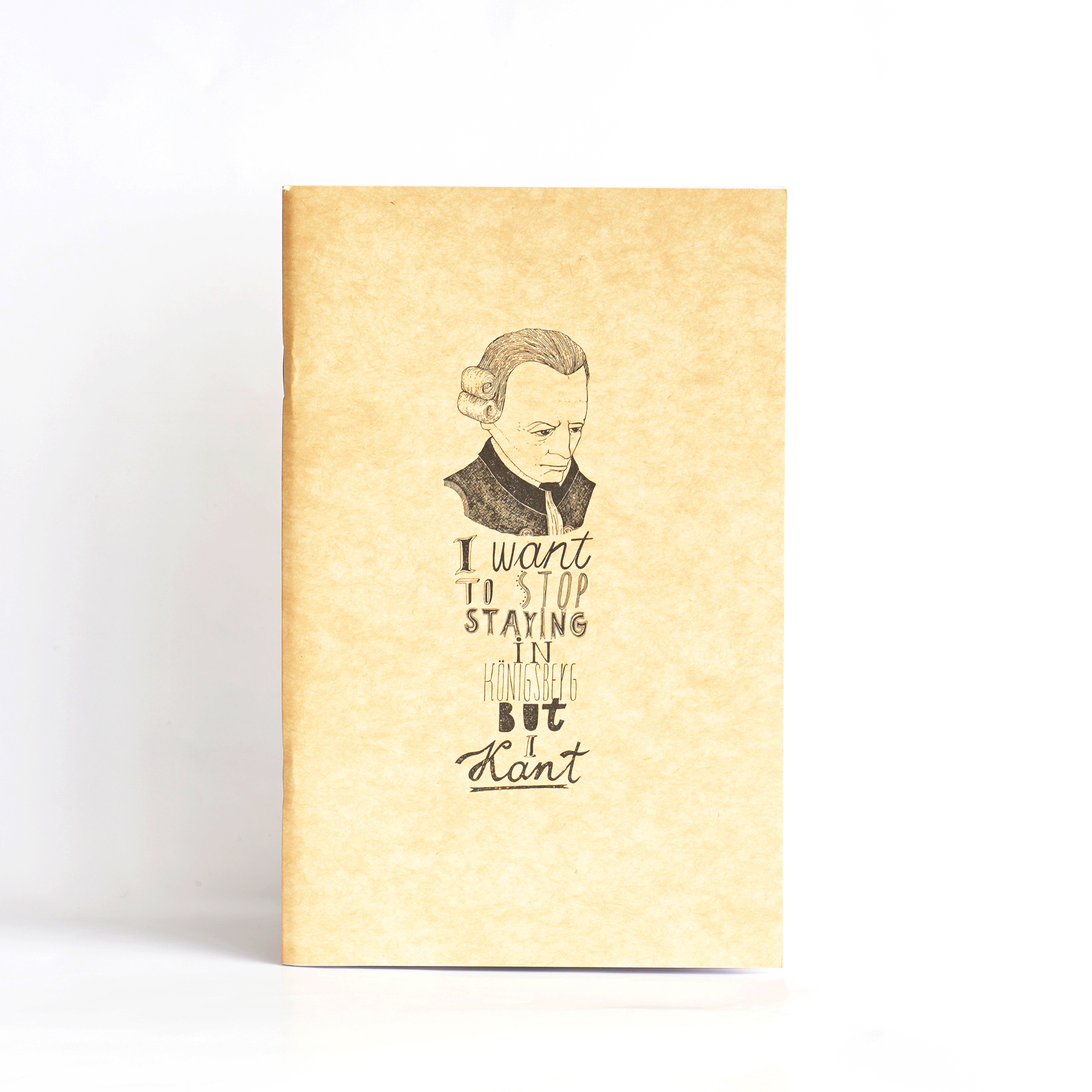 Изображение на обложке – Иммануил Кант с фразой "I want to stop staying in Königsberg but I Kant". В дословном переводе с английского фраза означает "Я хочу остаться в Кёнигсберге, но я Кант". Юмор основан на схожести в английском произношении фамилии великого философа и "can't" (в переводе – "не могу"). Фраза построена в форме известных цитат Иммануила Канта, поэтому читающий её проникается до глубины души и находит в ней скрытый смысл.
