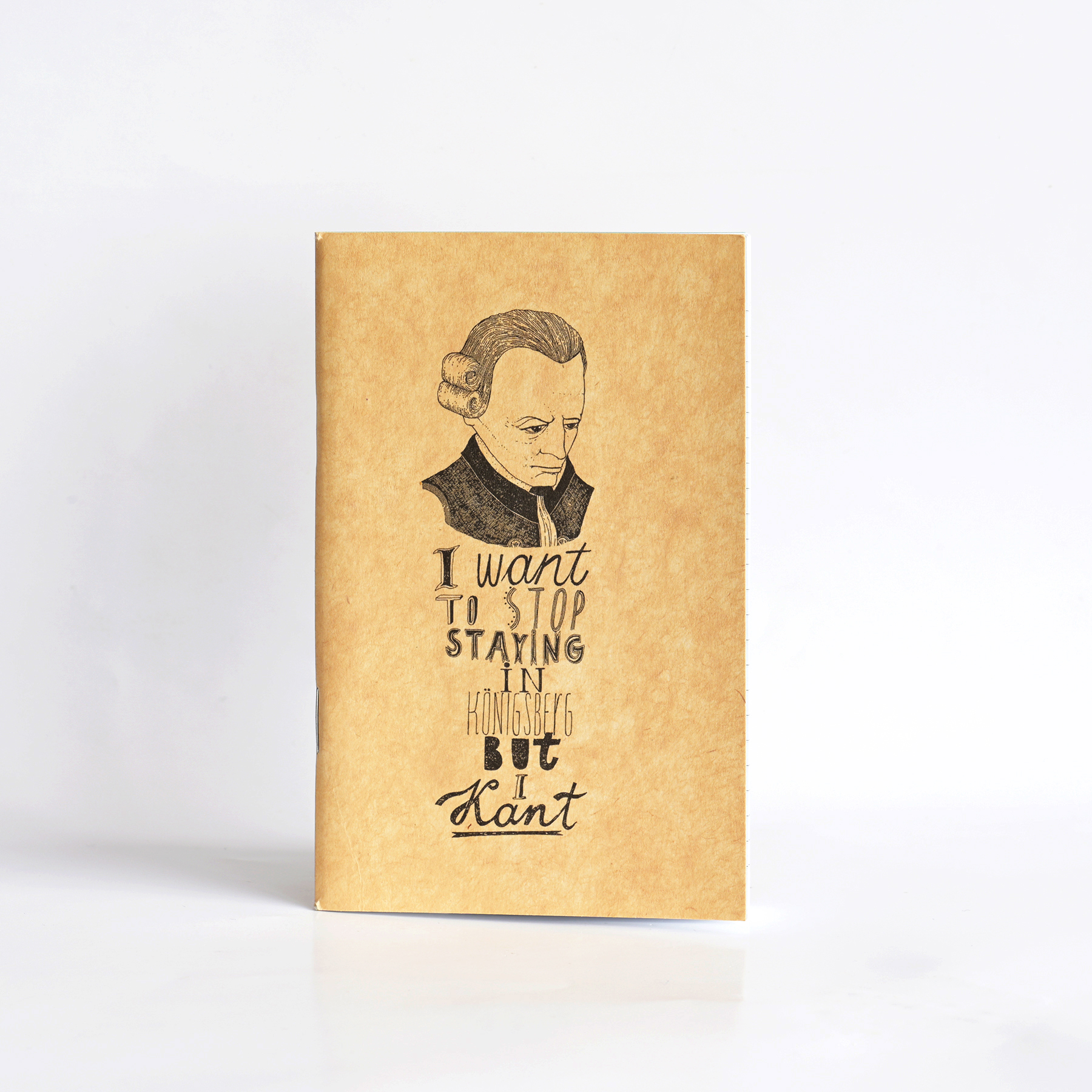 Изображение на обложке – Иммануил Кант с фразой "I want to stop staying in Königsberg but I Kant". В дословном переводе с английского фраза означает "Я хочу остаться в Кёнигсберге, но я Кант". Юмор основан на схожести в английском произношении фамилии великого философа и "can't" (в переводе – "не могу"). Фраза построена в форме известных цитат Иммануила Канта, поэтому читающий её проникается до глубины души и находит в ней скрытый смысл.