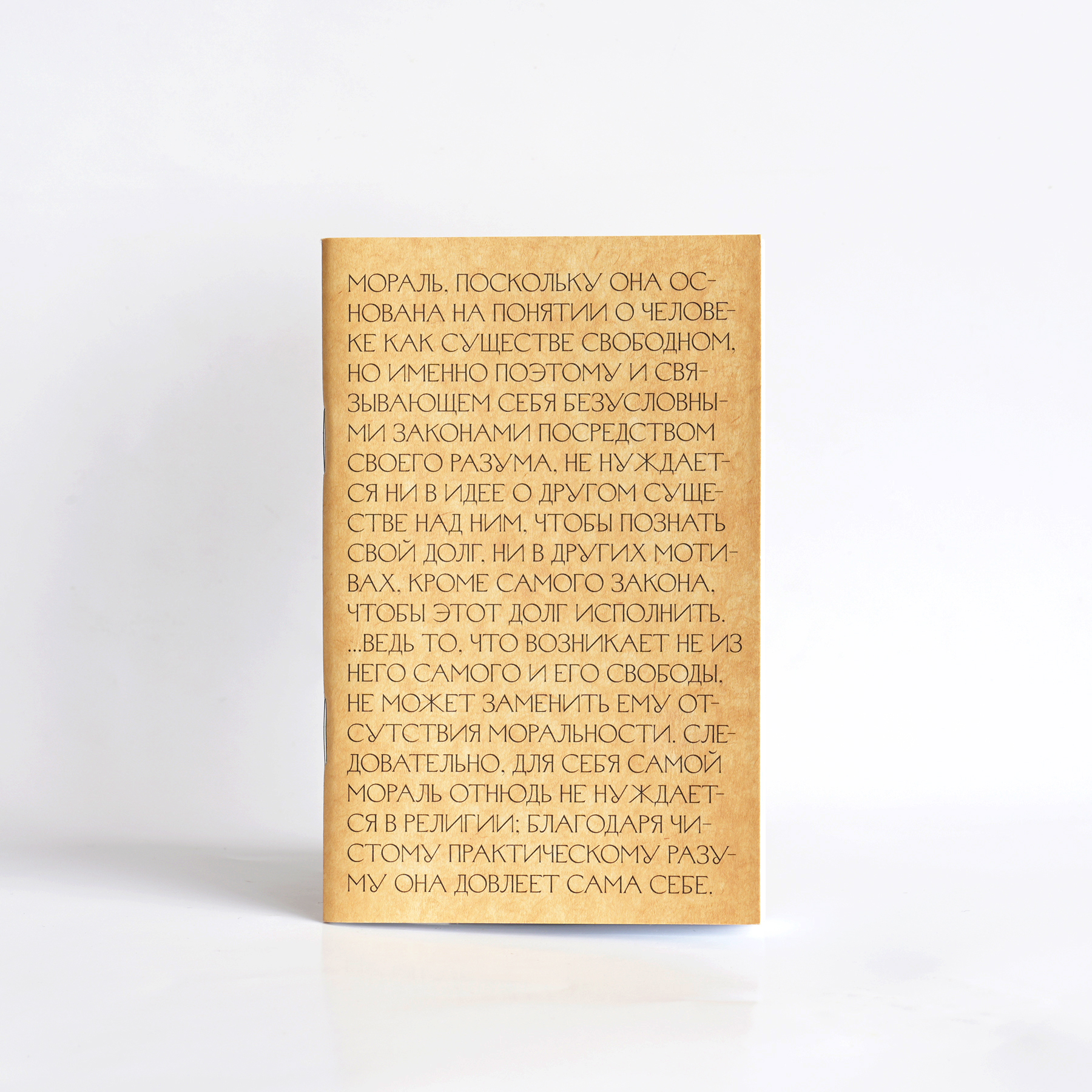 На обложке из крафтовой бумаги представлена цитата из «Категорический императива» Иммануила Канта. Центральное понятие в этическом философском учении о морали, представляющее собой высший принцип нравственности. .