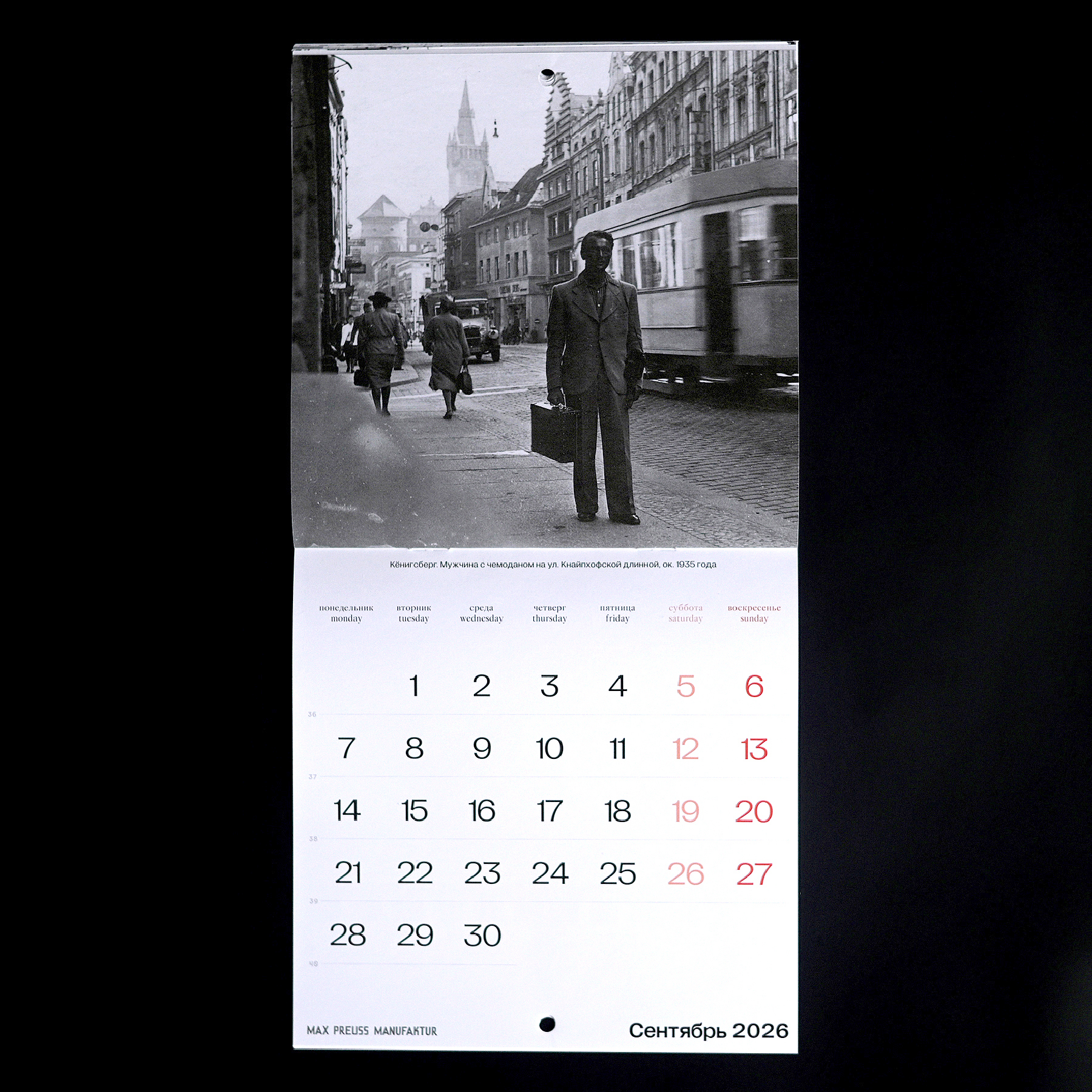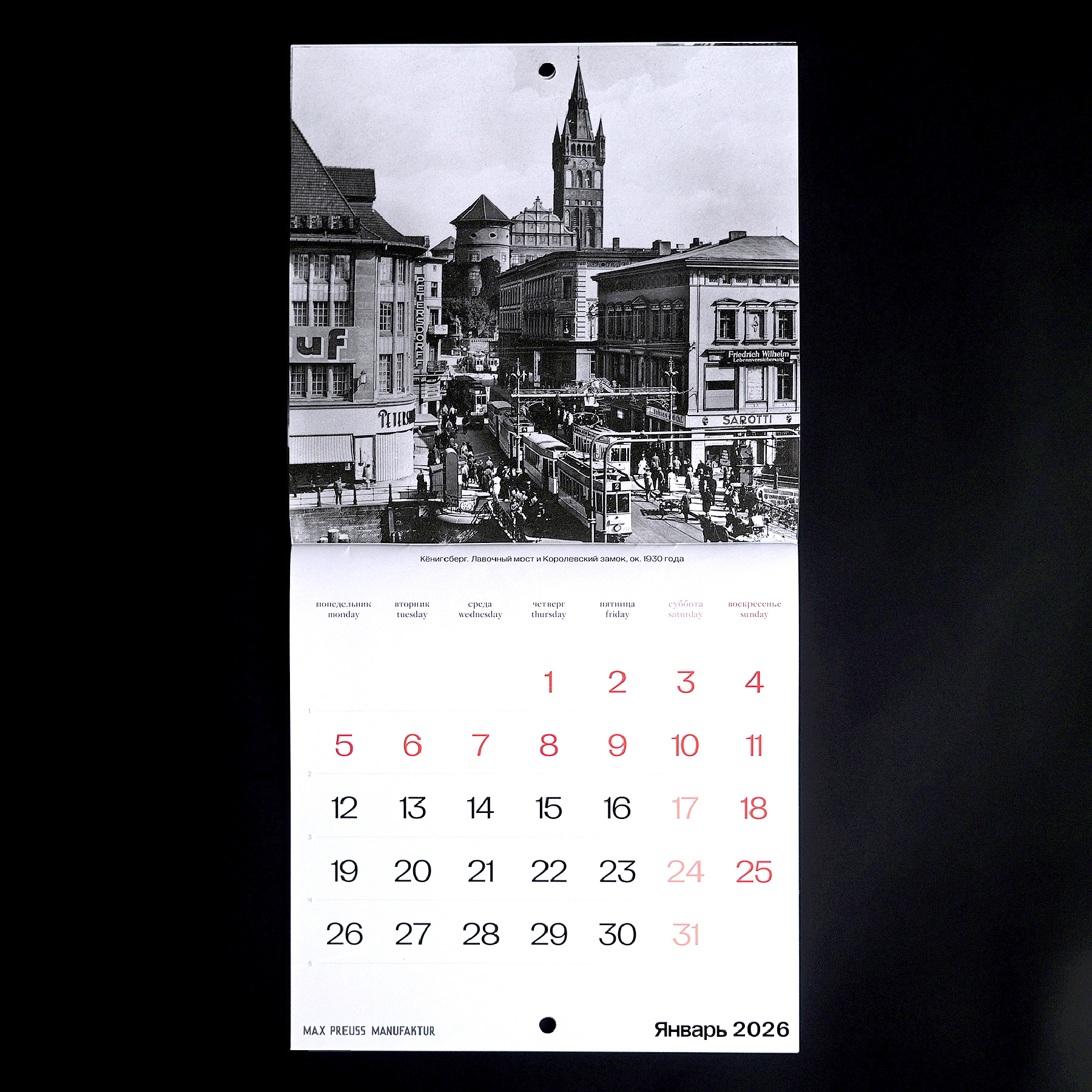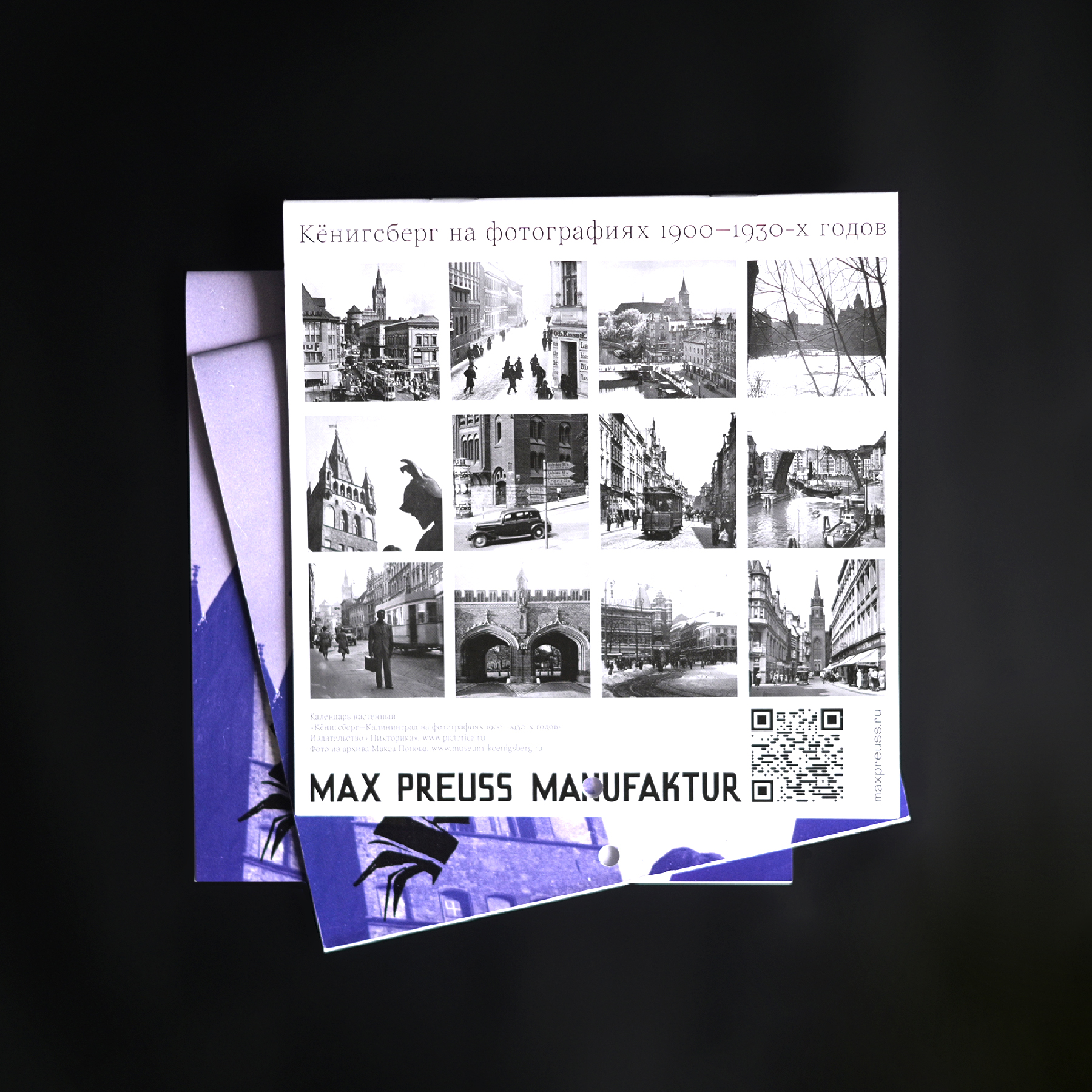Календарь с архивными фотографиями Кенигсберга начала XX века. На страницах — городские виды и детали, передающие атмосферу того времени.
