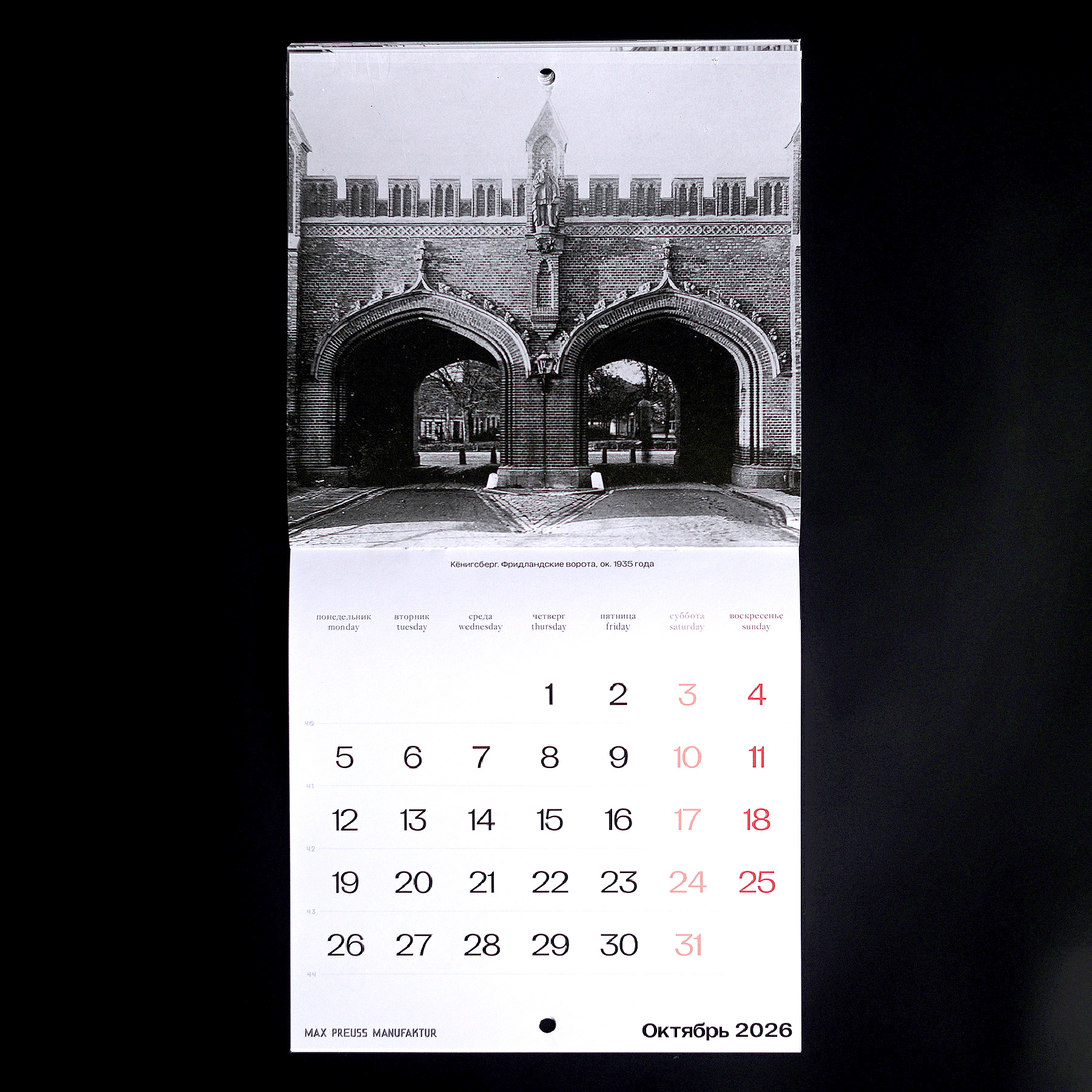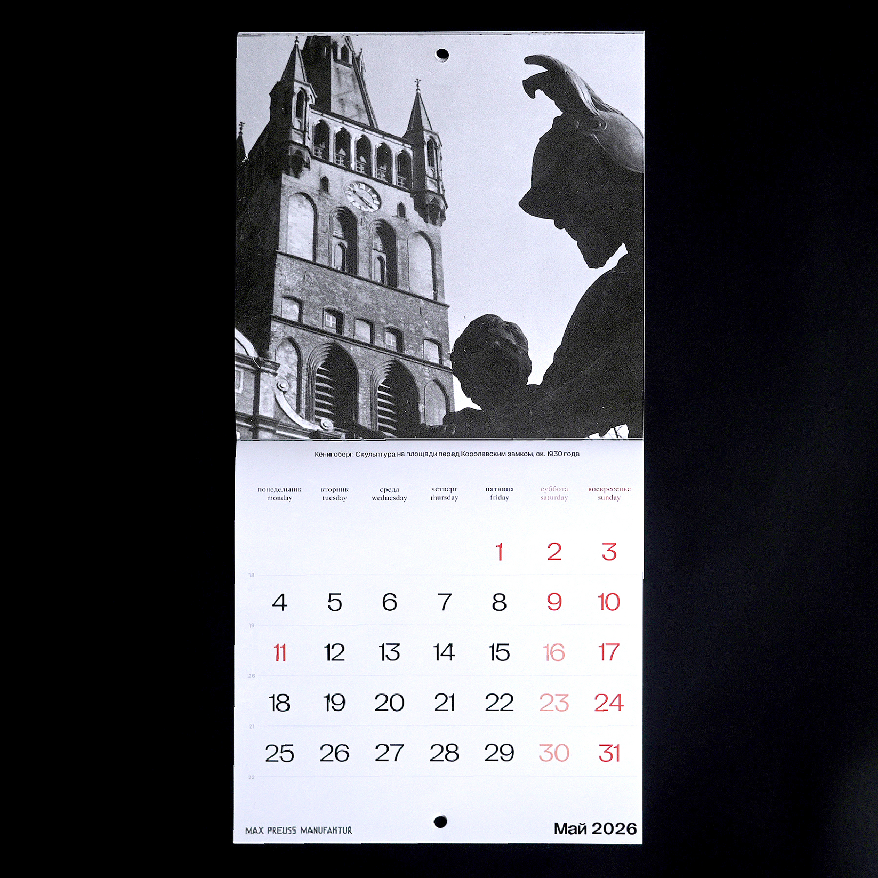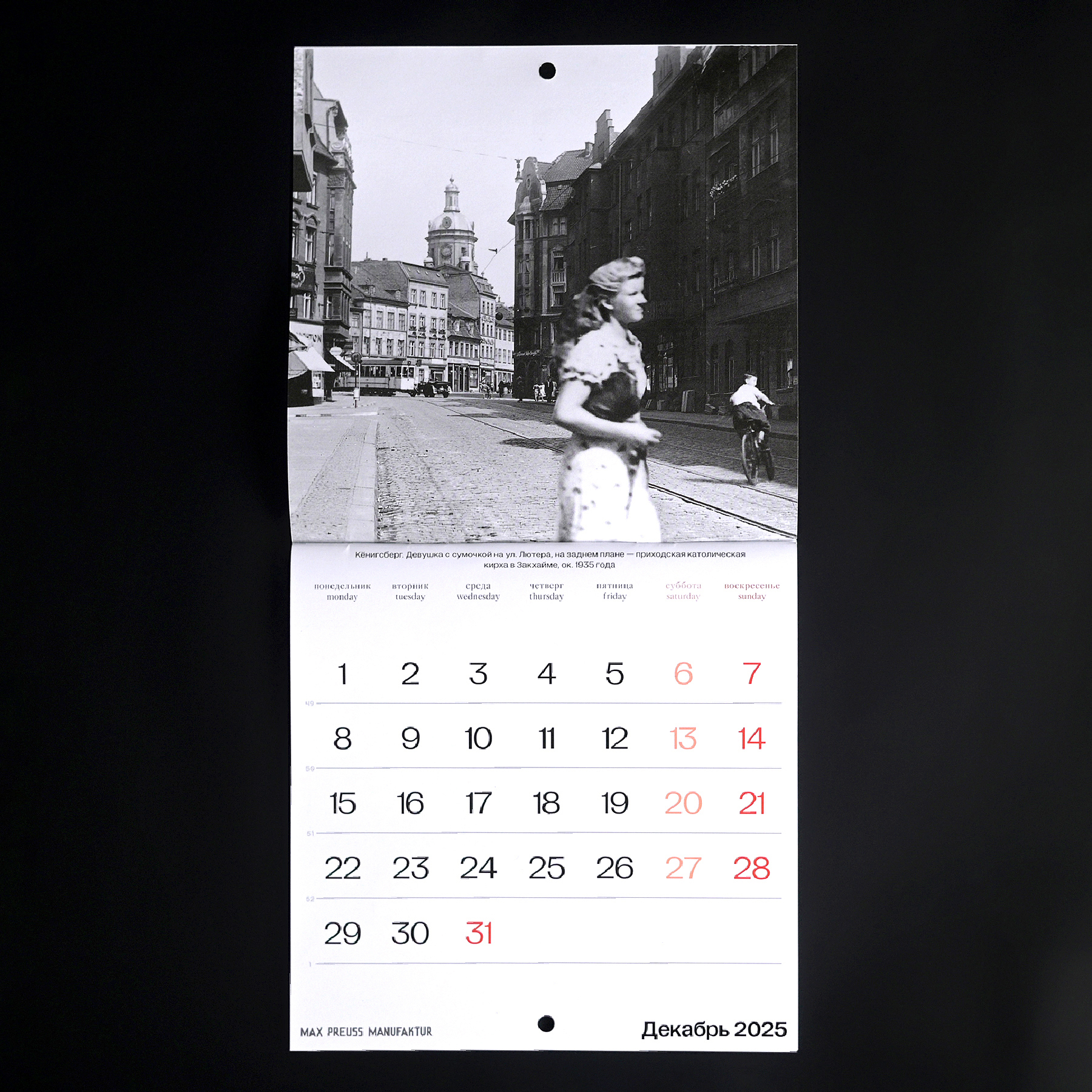 Календарь с архивными фотографиями Кенигсберга начала XX века. На страницах — городские виды и детали, передающие атмосферу того времени.