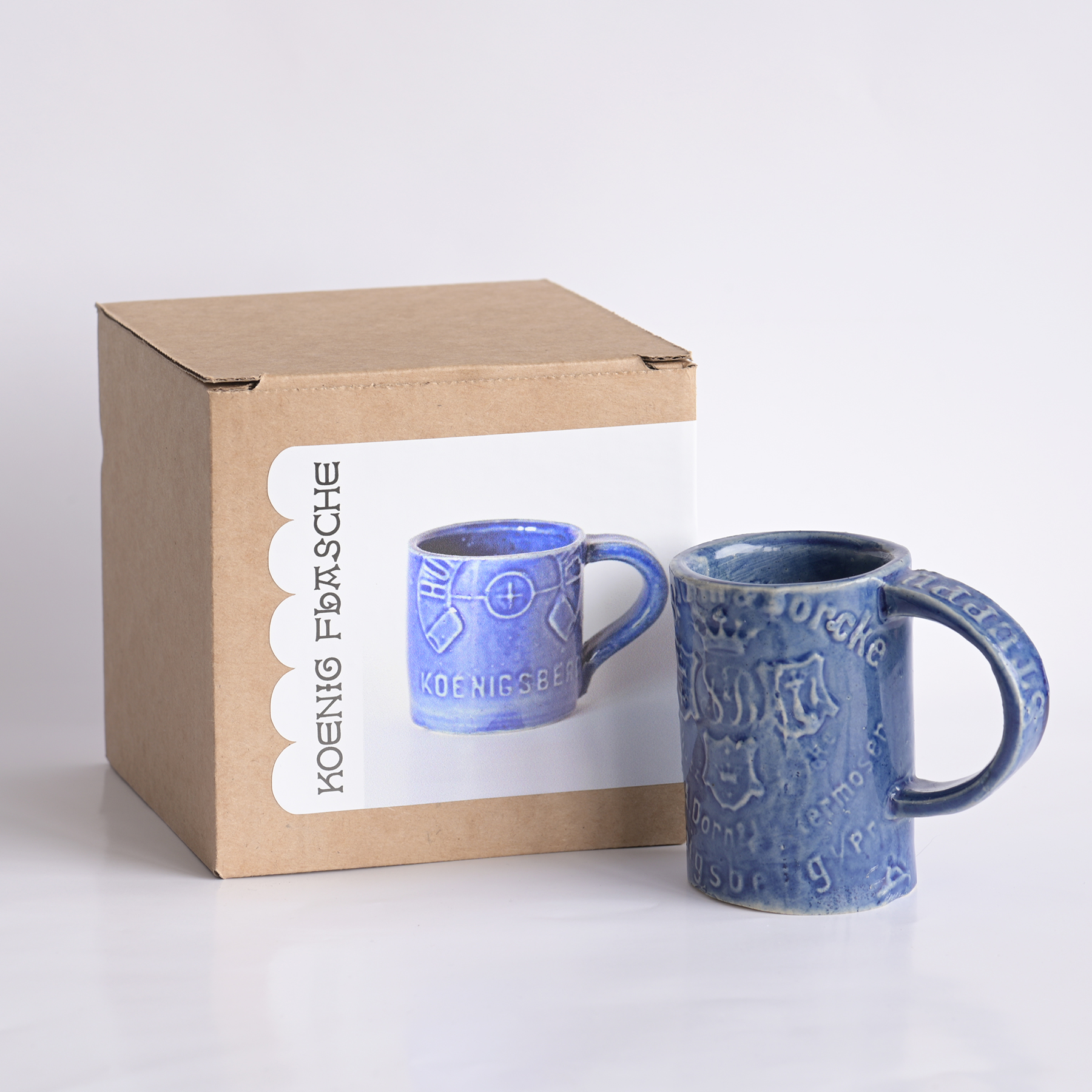 Königflasche (Кёнигфлаше) в переводе с немецкого означает «Кёнигсбергская бутылка». Стакан так называется, потому что тиснение на нём повторяет рисунки со старинных пивных бутылок и бутылок минеральной воды. Кстати, оригинальные изображения старинных бутылок можно увидеть в каталоге Архив ломзенских стеклянных копей.