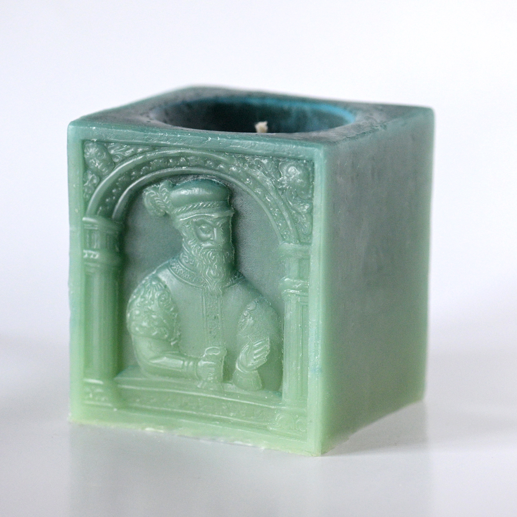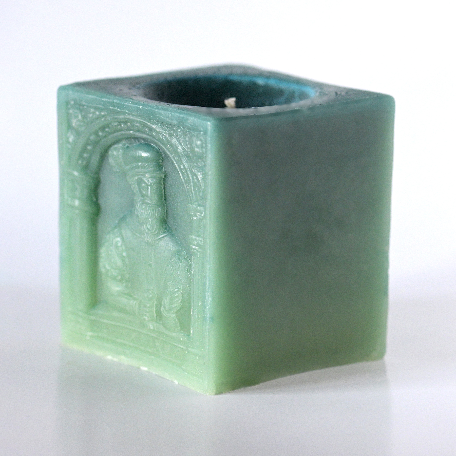 Образ знаменитого шпандинского купца воссоздан по осколкам изразцов, найденных при археологических раскопках в Россгартене. Он держит в руках мешочек с золотыми гульденами Георга Фридриха, которыми собирается расплатиться (это не точно) за корицу, гвоздику и кардамон, которыми мы ароматизировали эту свечу.