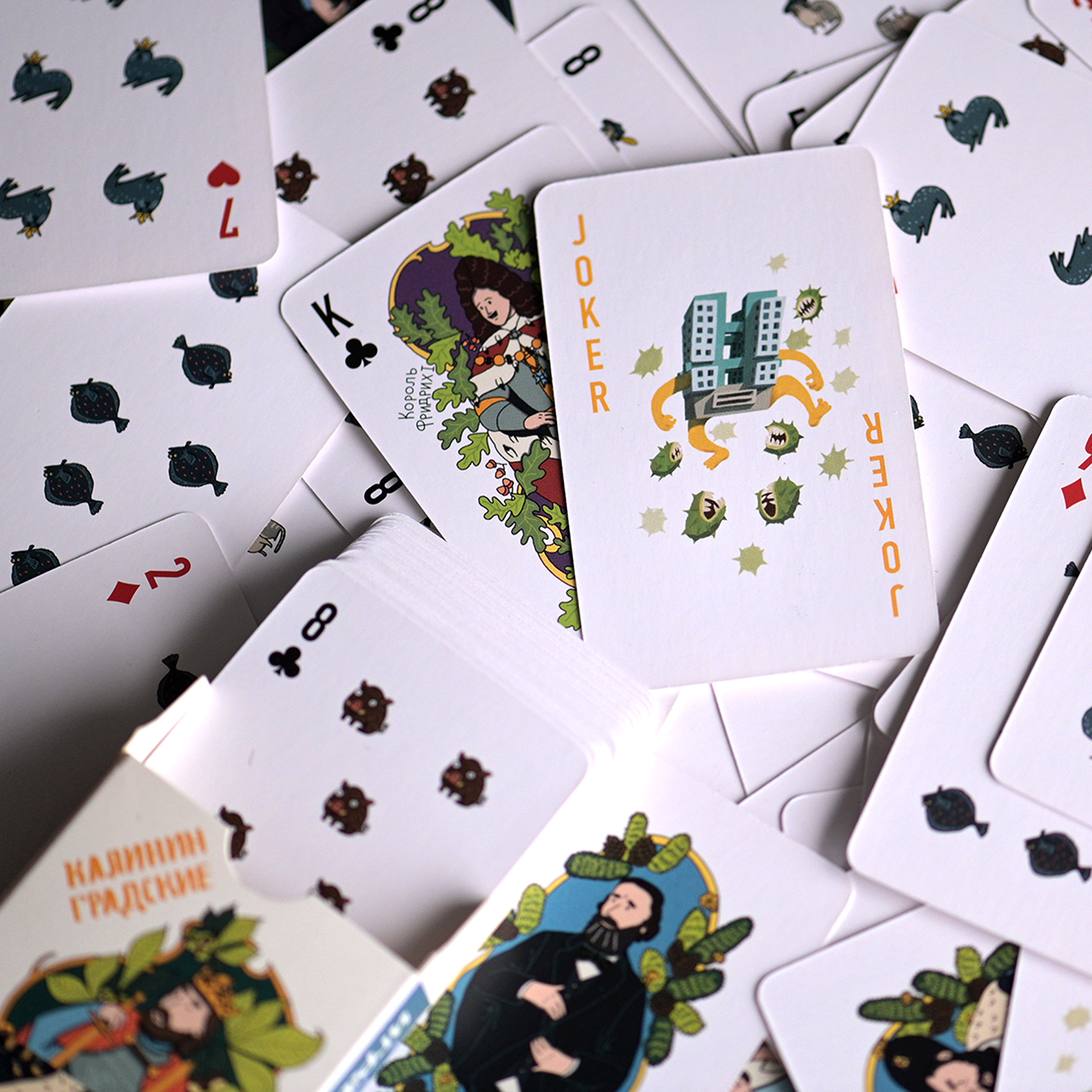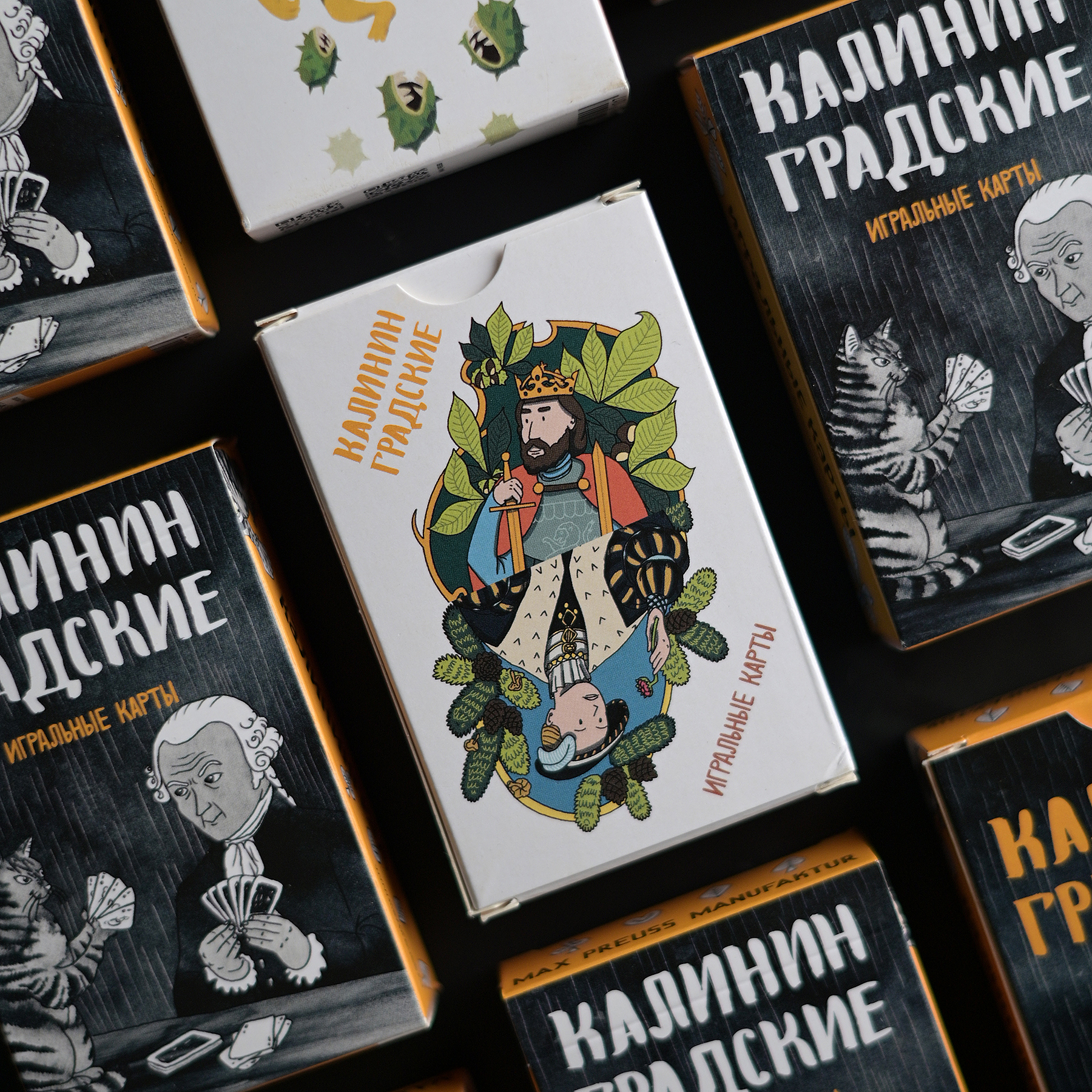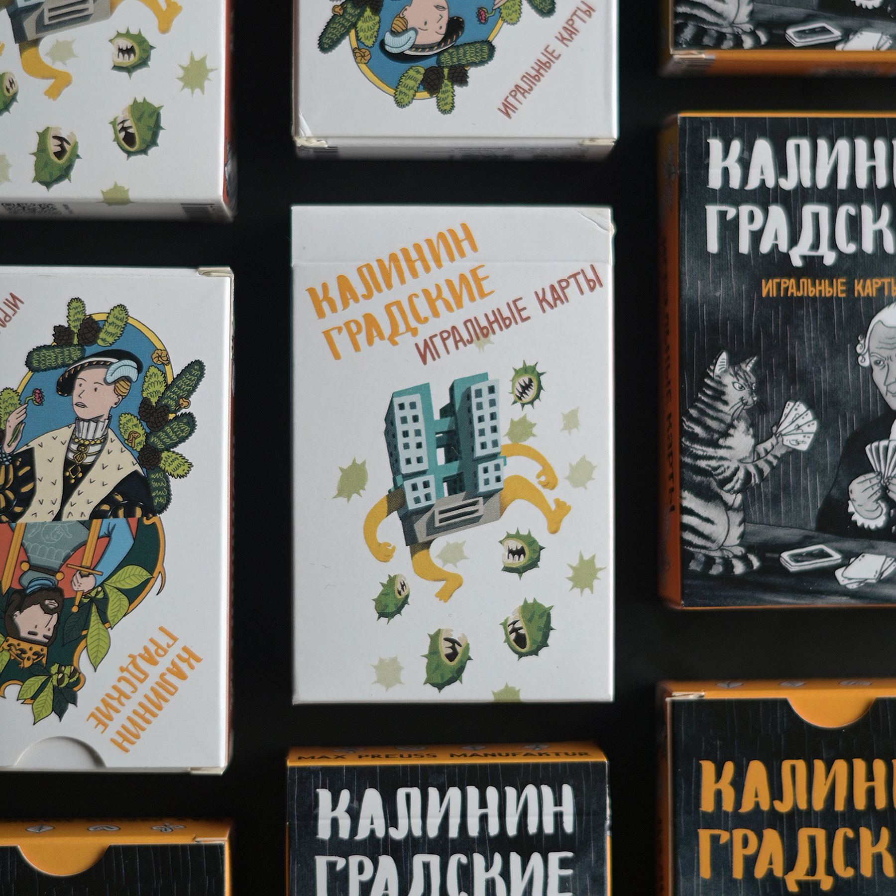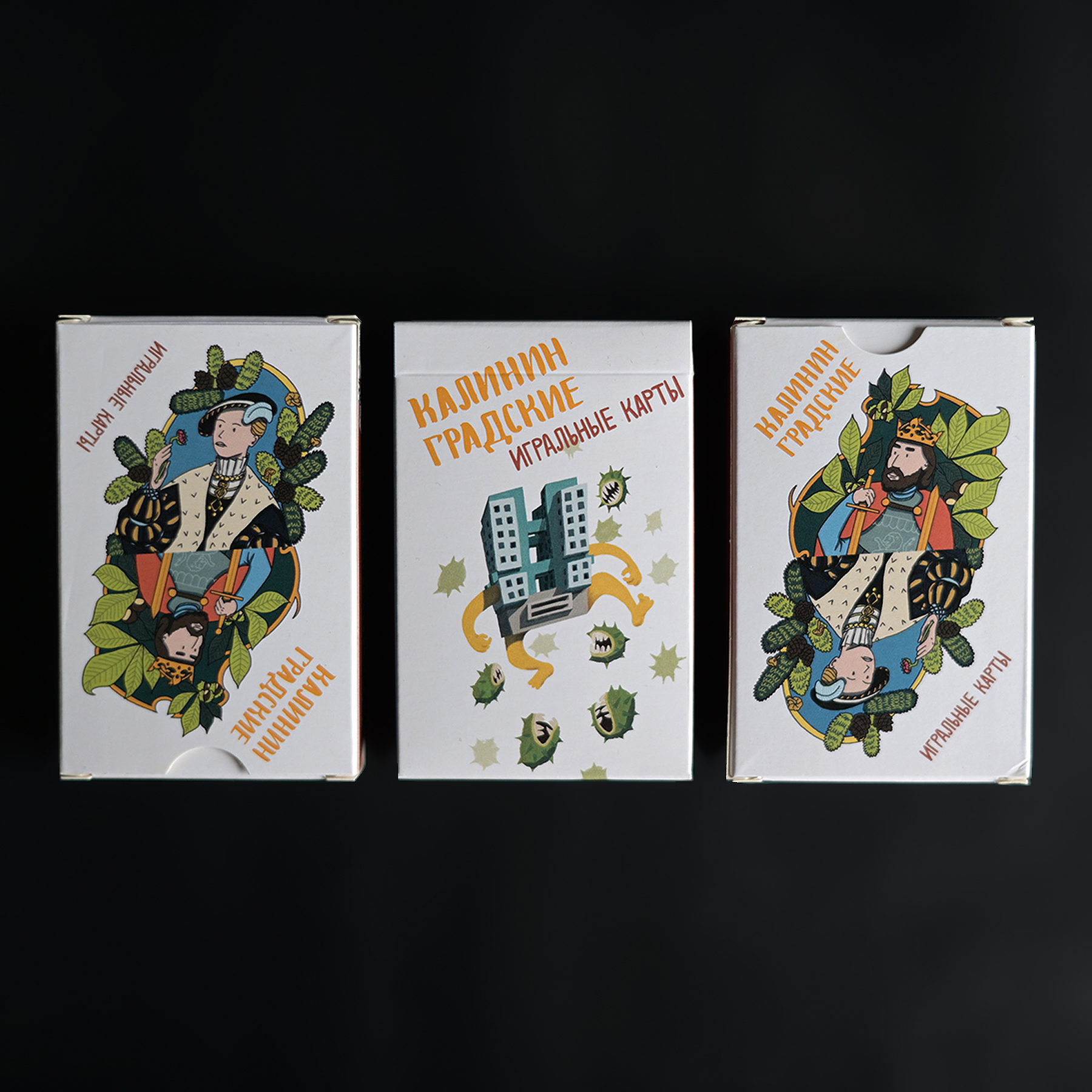 Набор игральных карт с локальными иллюстрациями о Калининграде. Выпущен в двух дизайнах коробок, какой попадется вам — решит случай :-).