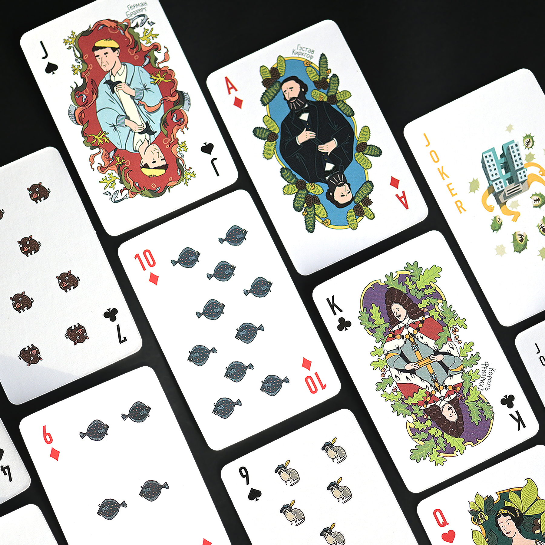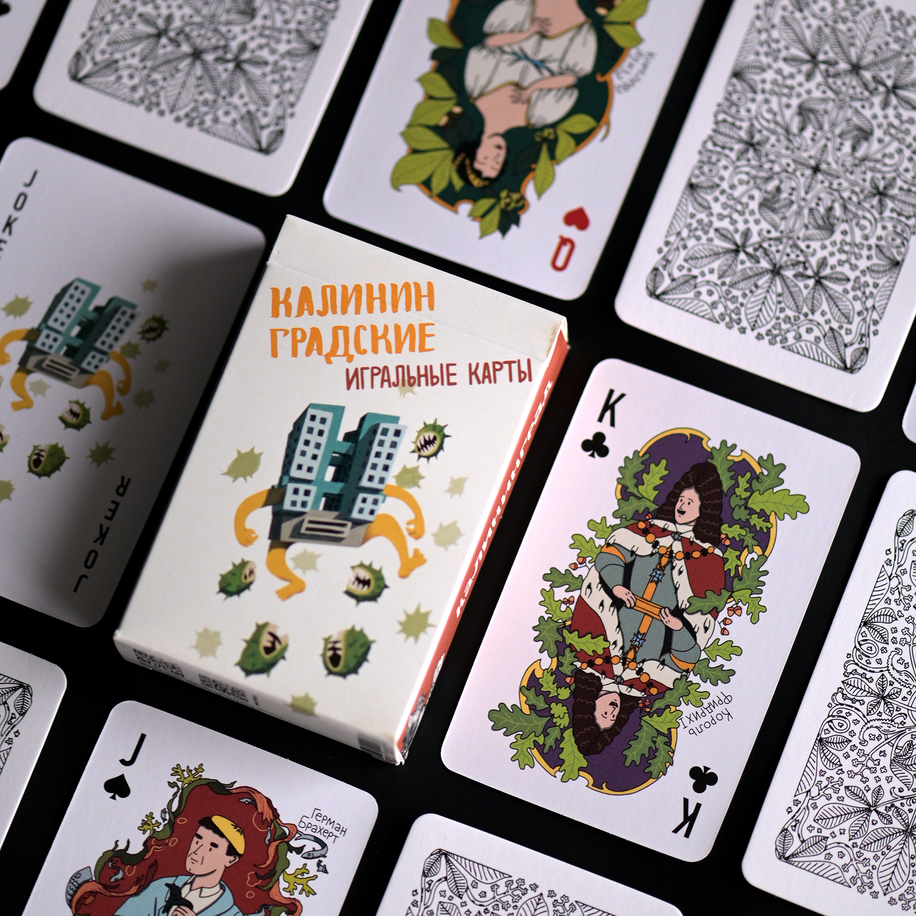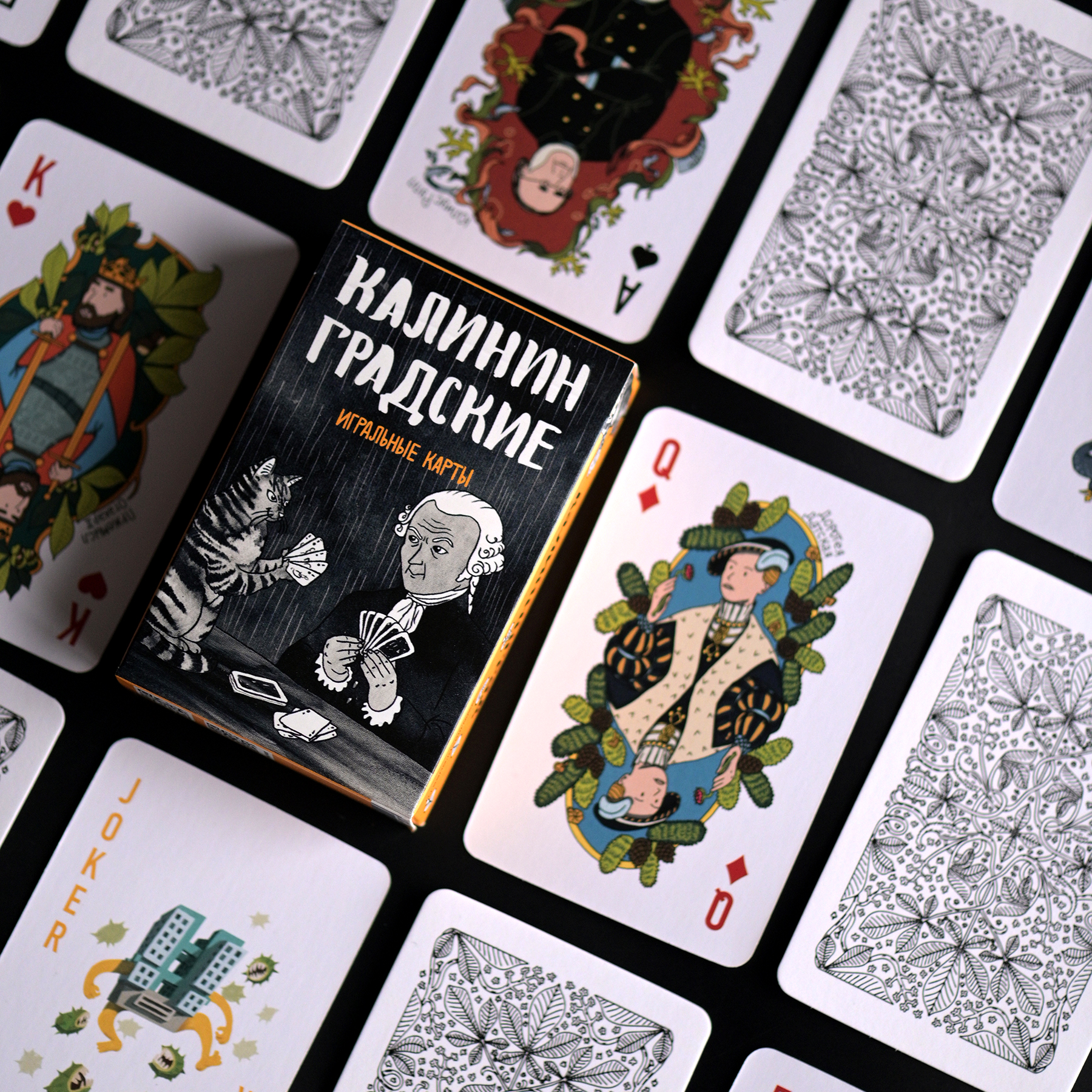 Внутри — колода из 54 карт с джокерами: фигурные карты (валет, дама, король, туз) выполнены с изображениями исторических личностей города; цифровые карты украшены небольшими милыми иллюстрациями, связанными с Калининградом.