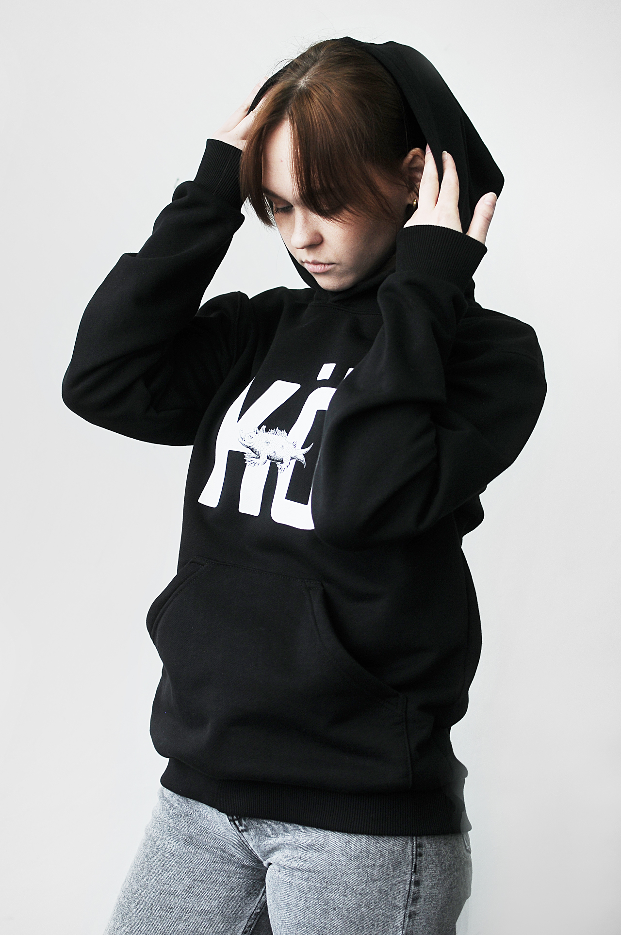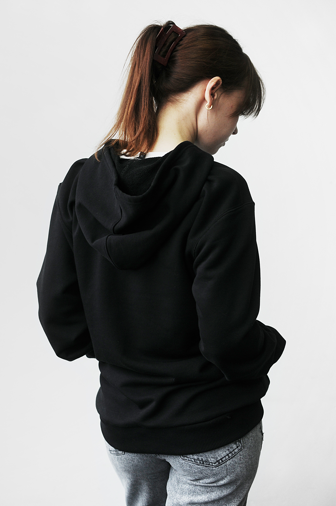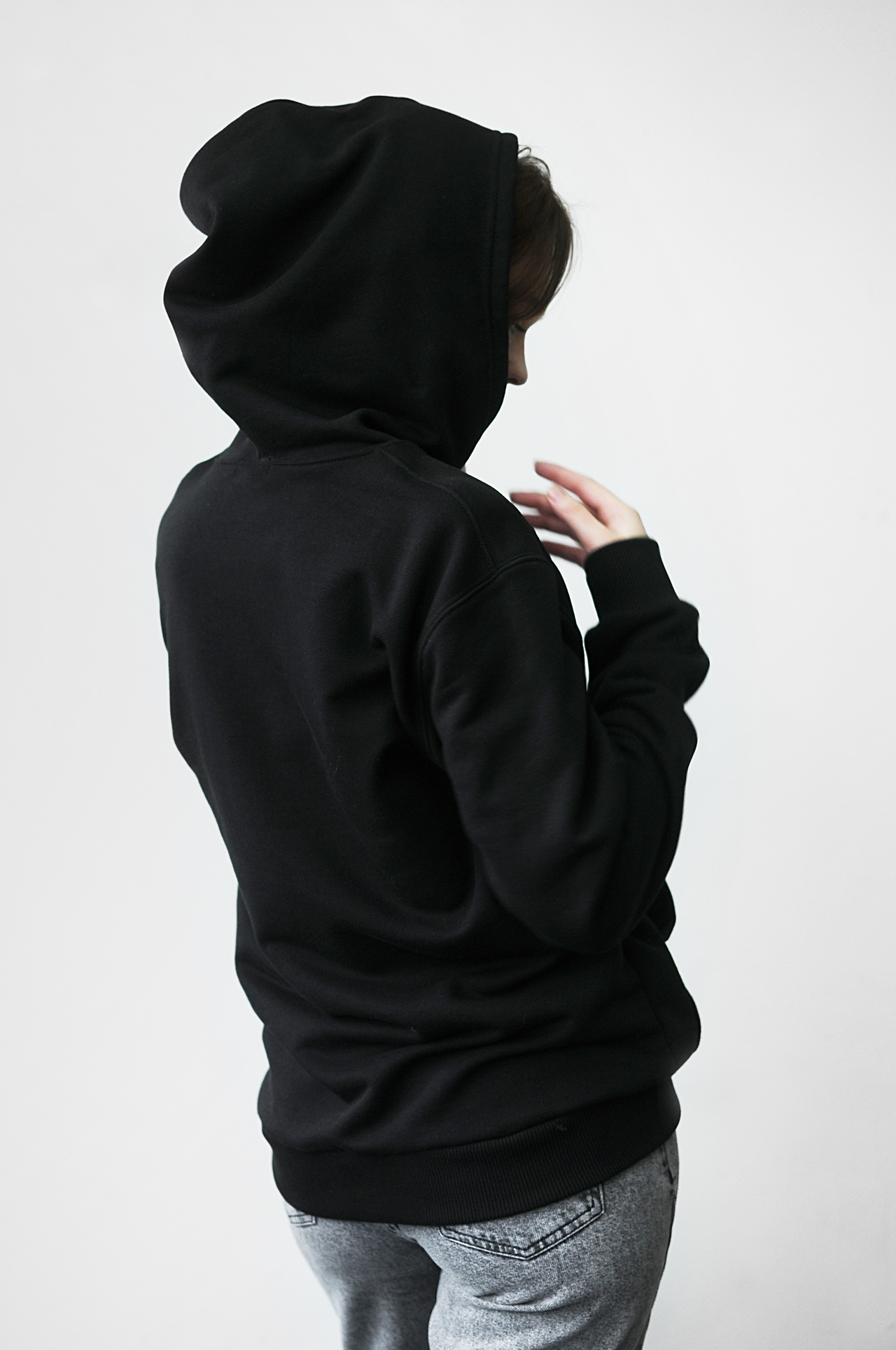 Худи (англ. hoodie от hood — «капюшон») чёрная, размер M. Худи похожа на толстовку, но, скорее, более сходна с анораком — лёгкой курткой с капюшоном, тоже надеваемой через голову. Как и анорак имеет большие накладные карманы-«кенгурятники» спереди и шнуровку-утяжку на капюшоне. Тёплая худи подходит для прогулок в прохладную погоду, занятий спортом и домашнего времяпровождения.